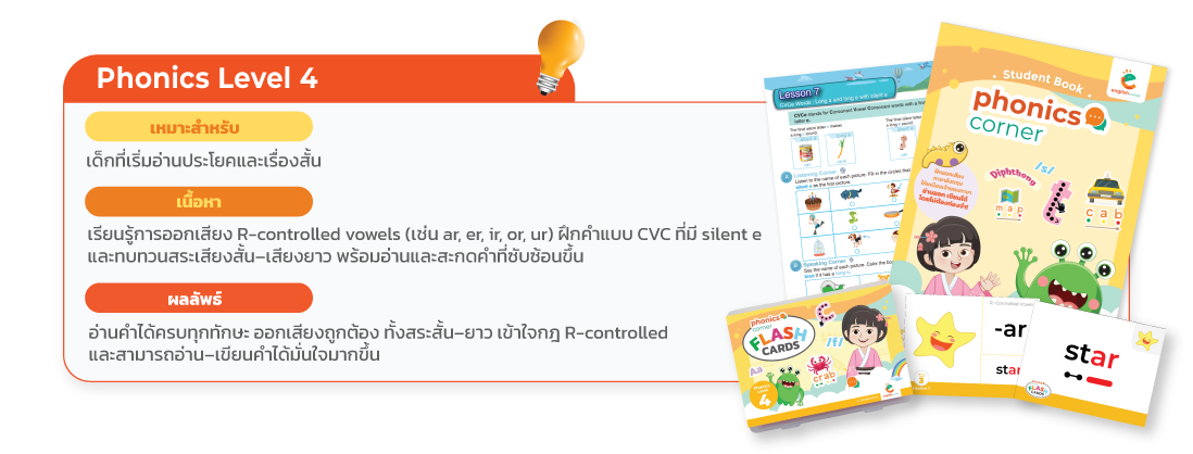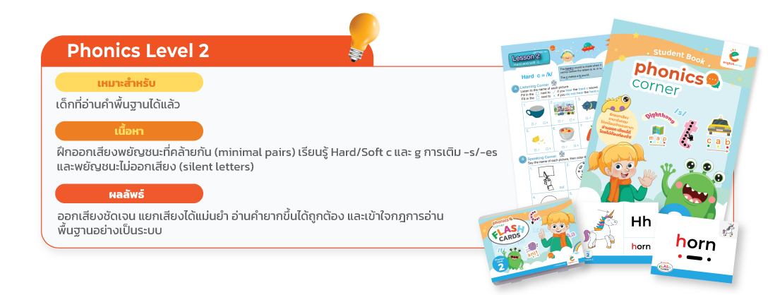 English Corner Phonics Course เป็นหลักสูตรที่เน้นการเรียนการสอนคำศัพท์ภาษาอังกฤษและการฝึกการออกเสียง ที่ถูกต้องสำหรับผู้เรียน โดยเนื้อหาของหลักสูตรได้รับการออกแบบมาเพื่อเพิ่มความก้าวหน้าของผู้เรียน และช่วยให้ผู้เรียน สามารถออกเสียงภาษาอังกฤษได้ดีตั้งแต่เริ่มต้น หลักสูตร Phonics เป็นหลักสูตรที่เหมาะกับผู้เรียนที่มีอายุตั้งแต่ 3 ปี ขึ้นไป โดยผู้เรียนทุกคนจะต้องเริ่มเรียน Phonics 1 ก่อน สำหรับกลุ่มอายุของผู้เรียนในแต่ละห้องจะแบ่งออกเป็น ช่วงอายุ 3-7 ปี, 8-12 ปี และ 13 ปีขึ้นไป ทั้งนี้ เพื่อให้ผู้สอนสามารถปรับวิธีการสอนให้เหมาะสมตามช่วงอายุของผู้เรียนนั่นเอง